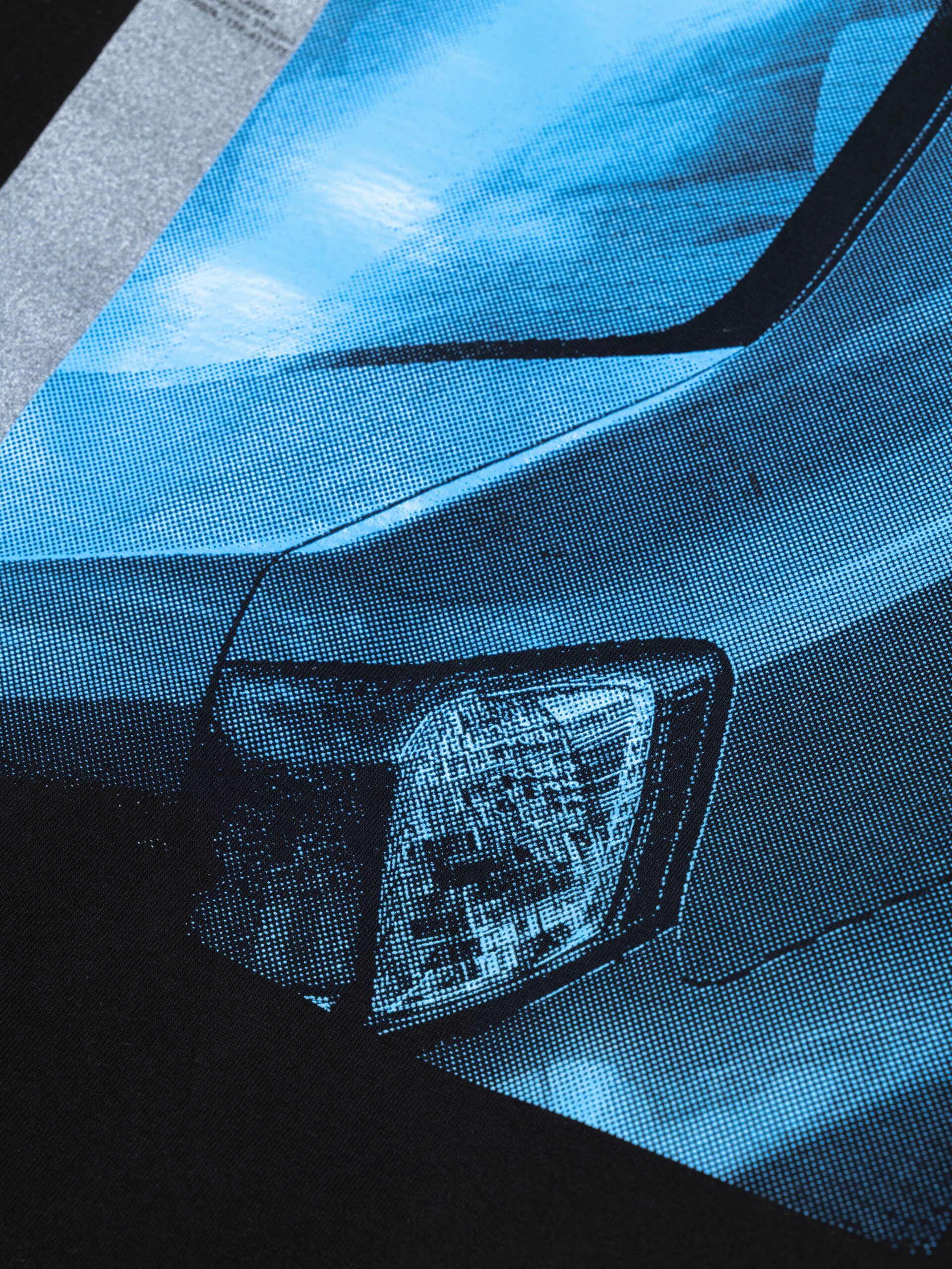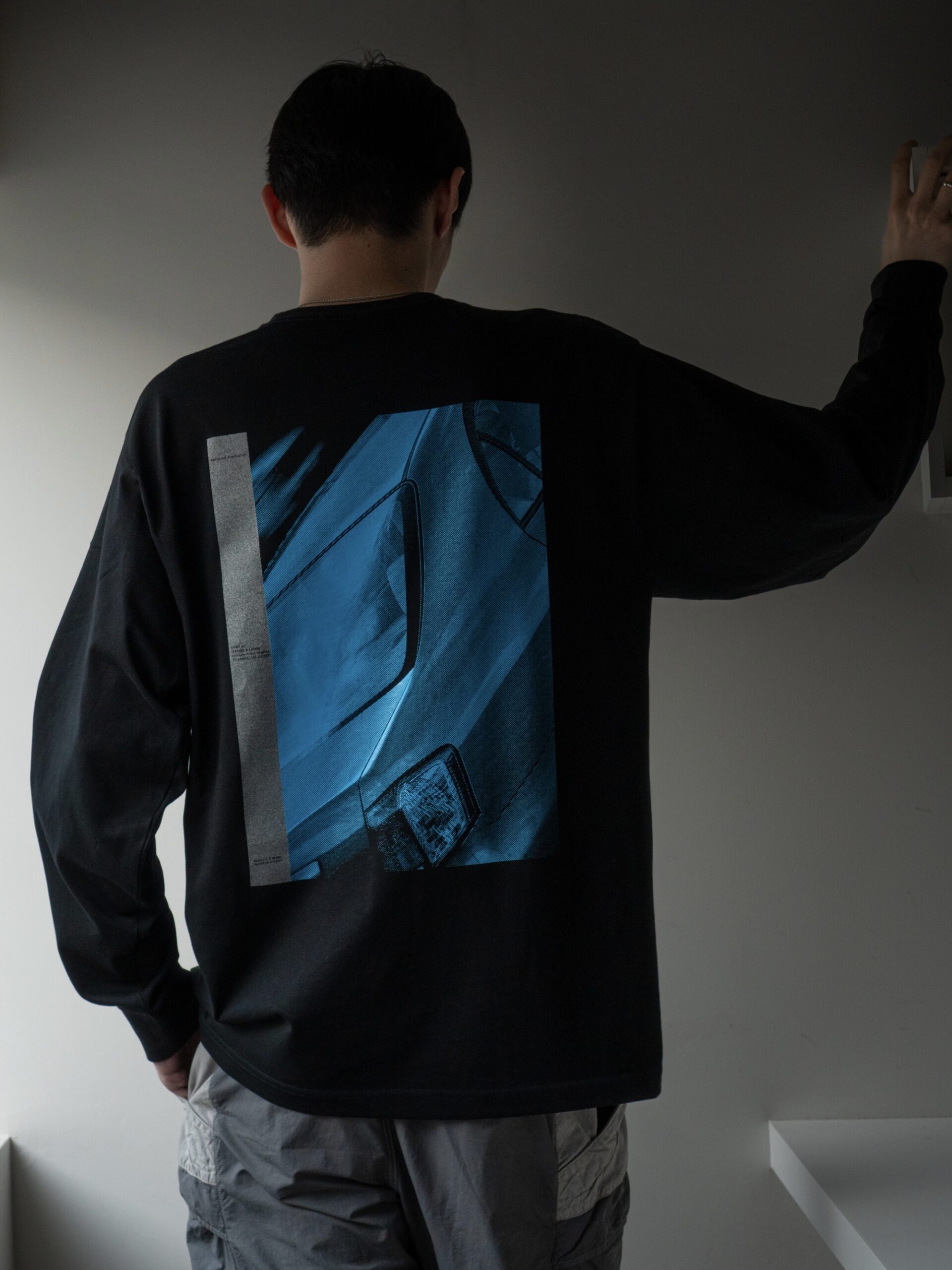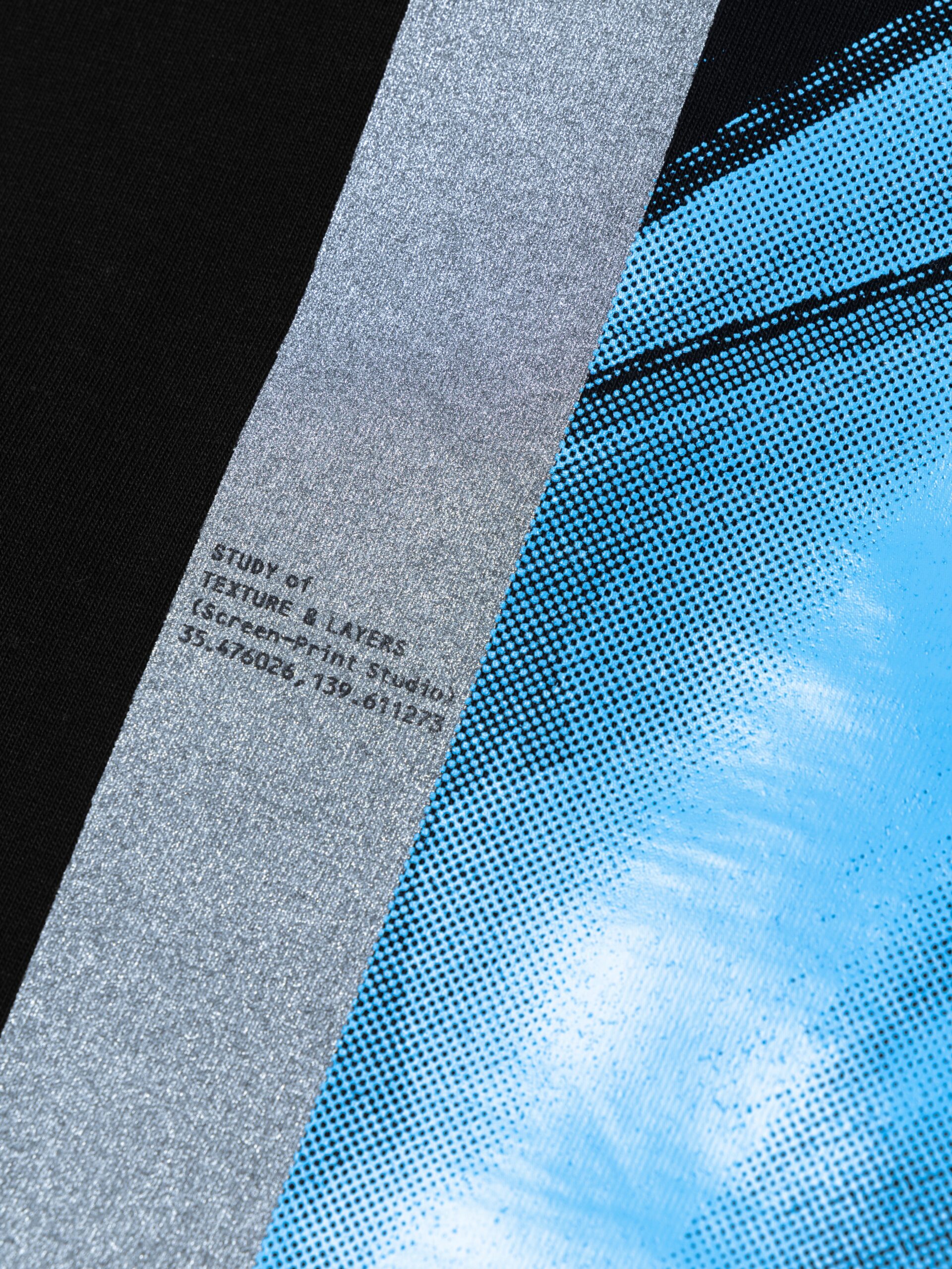 バックプリントには同一版を2層で重ね、上層にはツヤのあるコーティングのような透明感のあるインク、下層には発色のいいブルーのインクでプリント。独特の光沢を生み出した。